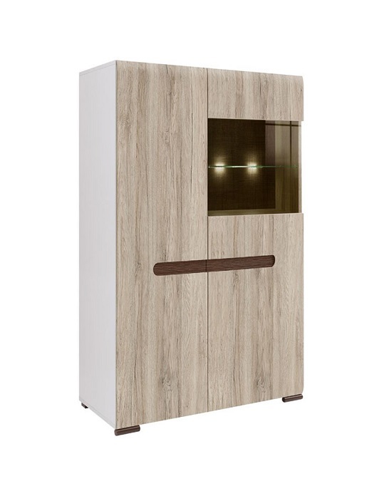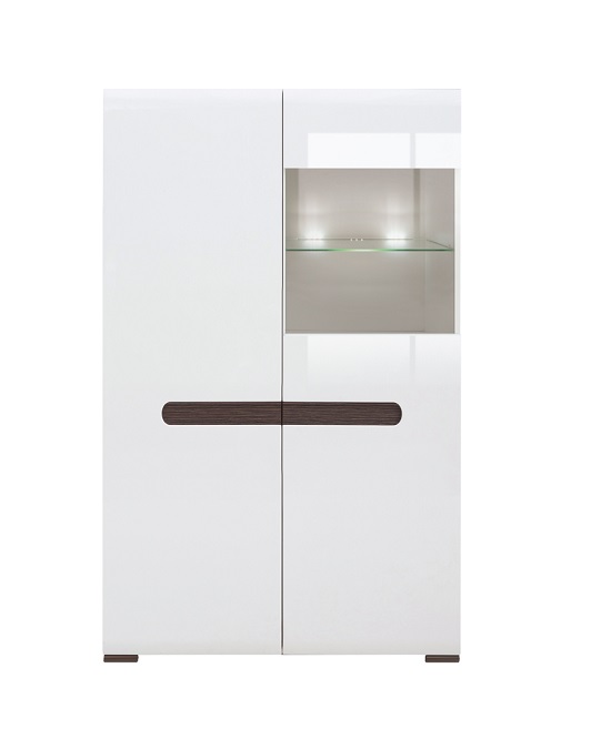 2 распашные двери, правая со стеклянной вставкой (стекло – закаленное, бронзовое), за которой расположена 3 полки из ДСП и стеклянная полка (стекло прозрачное), левая – глухая, за которой расположены 3 полки из ДСП ламинированной;