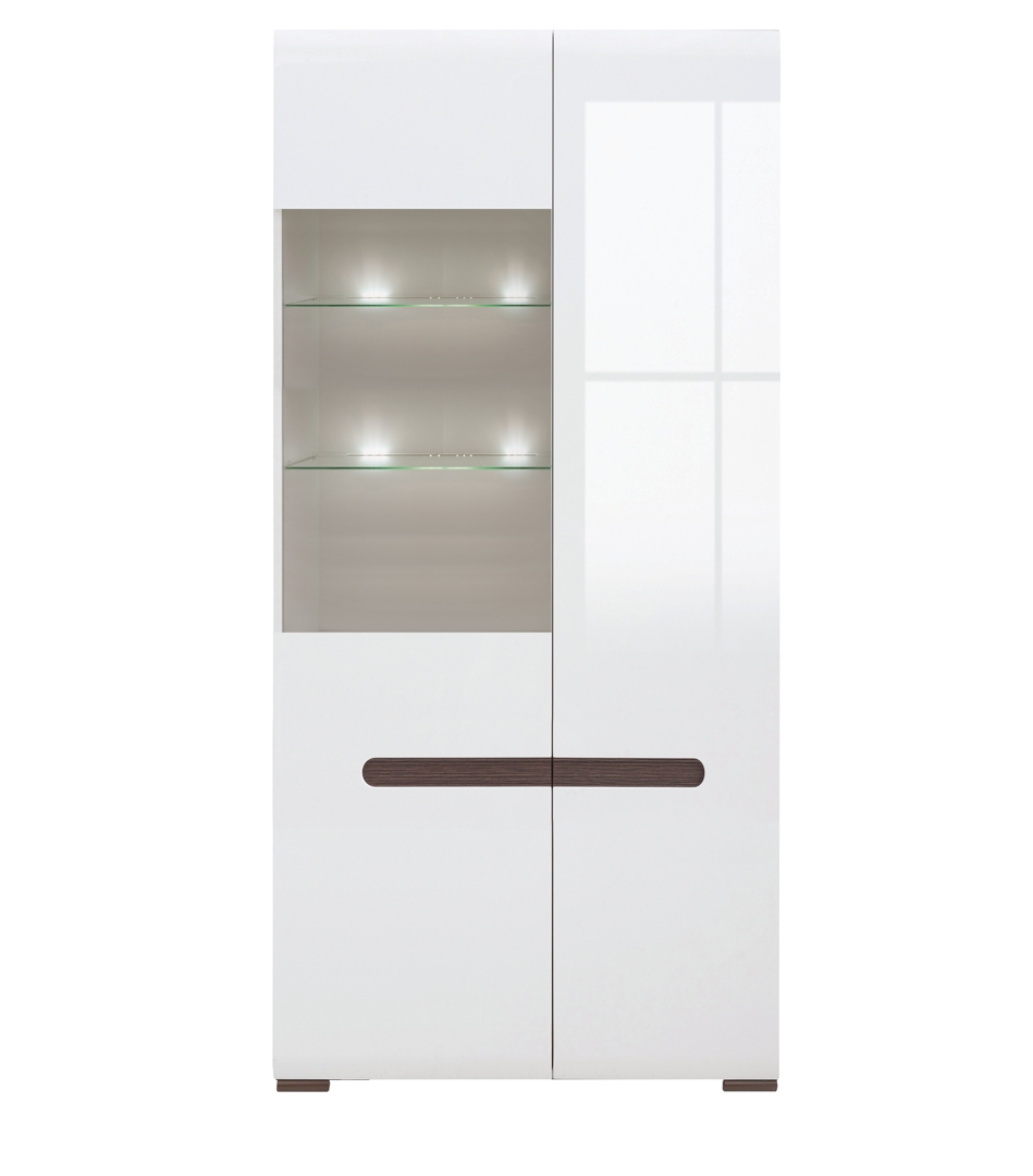 2 распашные двери, левая со стеклянной вставкой (стекло – закаленное, бронзовое), за которой расположена 3 полки из ДСП и 2 стеклянных полки (стекло прозрачное), правая – глухая, за которой расположены 4 полки из ДСП;