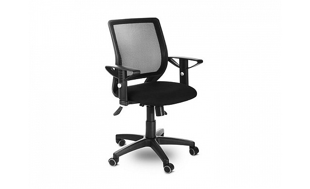 Кресло оснащено механизмом качания с фиксацией в любом положении. Регулируемые по высоте подлокотники и эргономичная спинка из ткани-сетки.