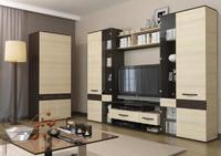 Гостиная САПФИР выполнена в стиле хайтек, удобные пеналы, стеклянные полки для посуды и парящая ТВ тумба с двумя ящиками. Возможно добавить платяной шкаф. Цвет гостиной : Дуб Кантербери- Дуб Сонома, Венге - Белый.