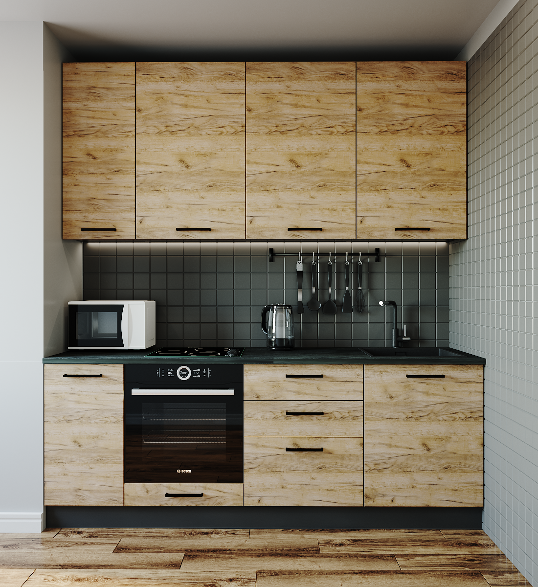 Срок изготовления кухни 7 рабочих дней. Кухню можно менять по комплектации, дополнять, удалять модули, менять цвет фасадов, корпуса и столешницы.