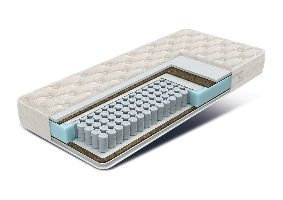 Матрас средней жесткости на основе блока независимых пружин EVS 500, который равномерно распределяет нагрузку по всей горизонтальной поверхности матраса и обеспечивает направленную поддержку позвоночника. Сочетание холлкона и латексированной кокосовой койры обеспечивает комфортную среднюю жесткость и физиологически правильное положение позвоночника во время сна.