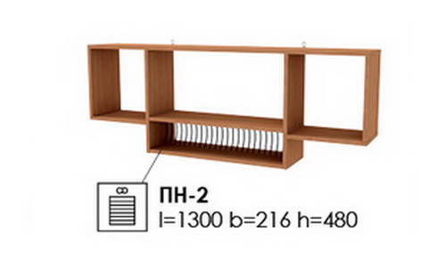 Полка ПН-2 имеет необычный дизайн. Вы можете повесить ее над компьютерным столом и размещать на ней различные подручные материалы. Полка имеет двухъярусную структуру. Полка крепится на стенку, благодаря двум задним планкам.