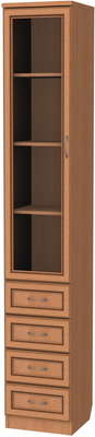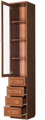Шкаф разделен на два отделения. Верхнее отделение предназначено для хранения книг. В нем, за стеклянной дверью расположены четыре полочки. Полки обладают одинаковым размером и крепятся они на равном расстоянии одна от одной. Большим преимуществом является то, что смоделированы полочки таким образом, чтобы на них можно было выставлять книги любых форматов, даже самые большие, наподобие энциклопедий, справочников, словарей, атласов.