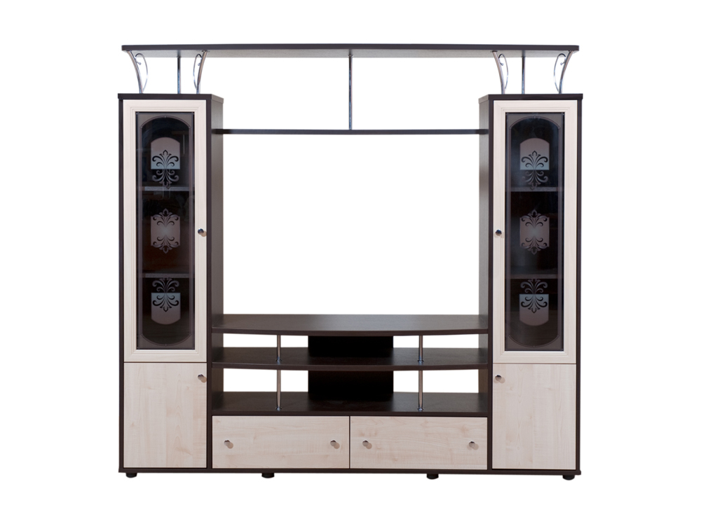 «Симфония 5.10» – это легкая и компактная гостиная, выполненная в комбинации двух цветов: светлого и темного. Стеклянные дверцы универсальных пеналов декорированы витражными рисунками и оформлены в МДФ-погонаж с фрезеровкой, что подчеркивает современный дизайн этой модели.