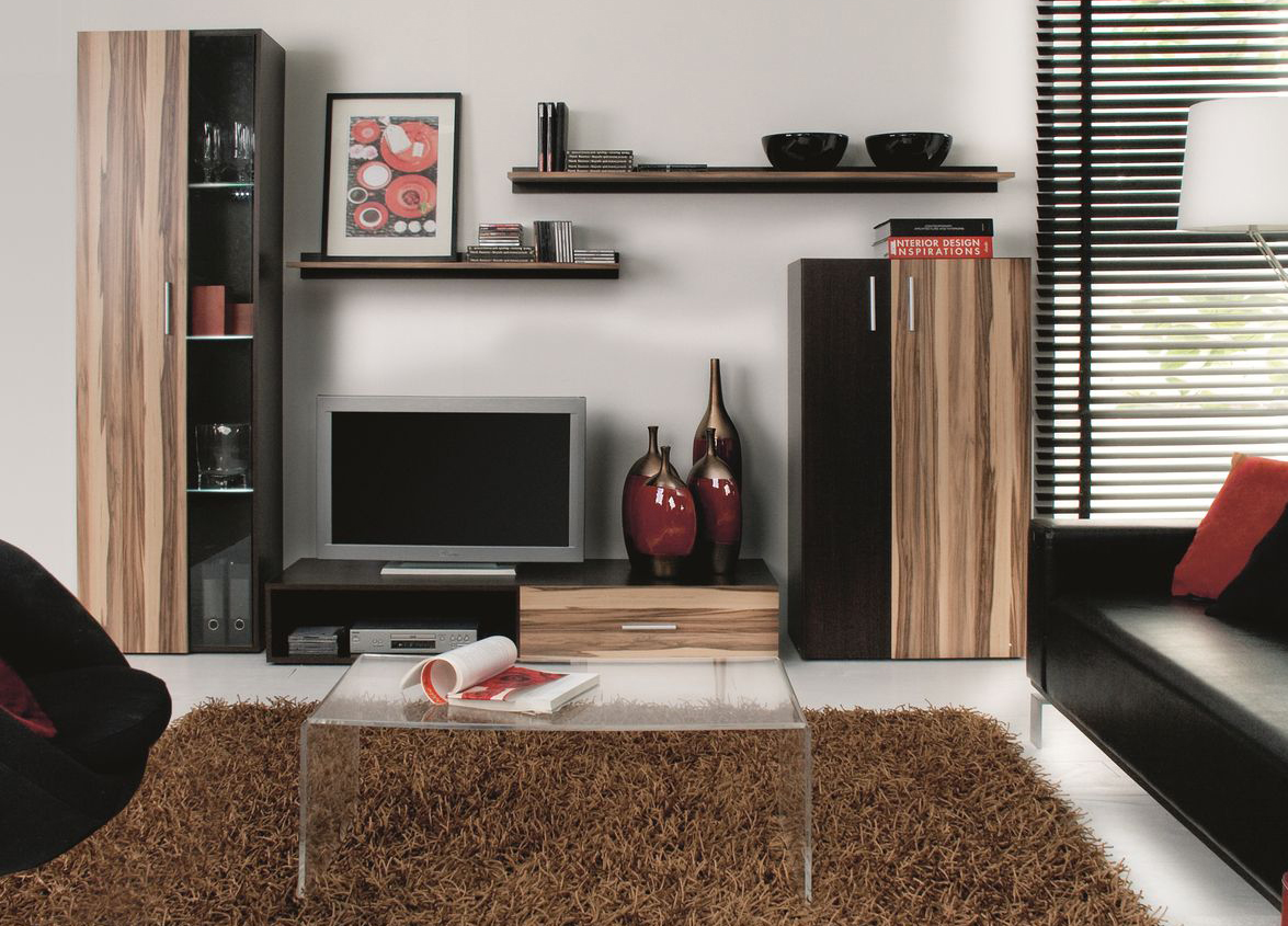 В этой стенке все гармонично - нет ничего лишнего: пенал, шкафчик, тумба под ТВ, полки навесные.