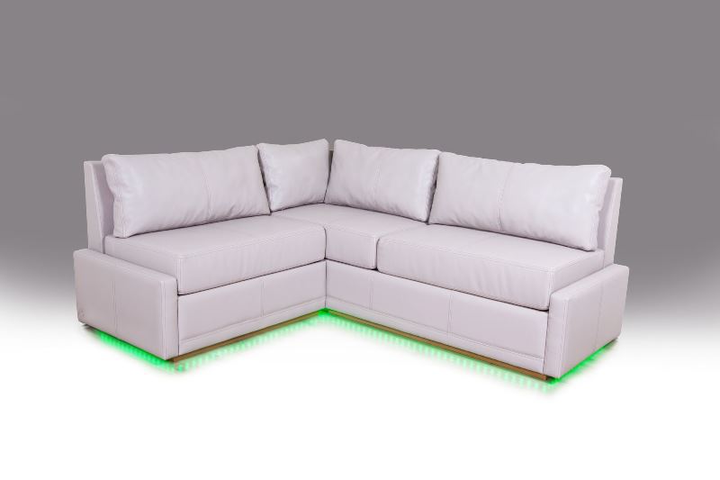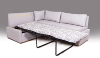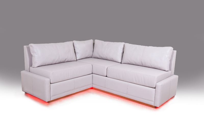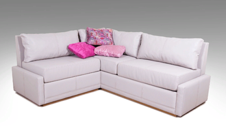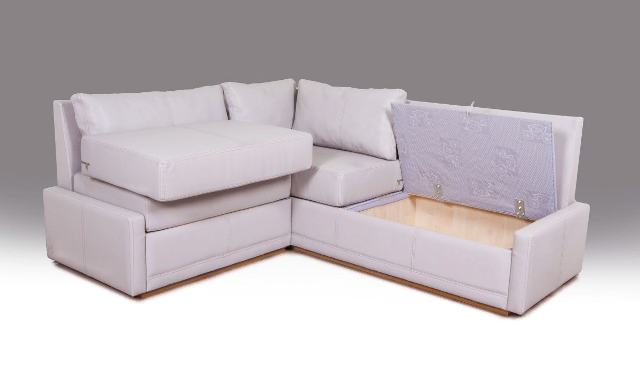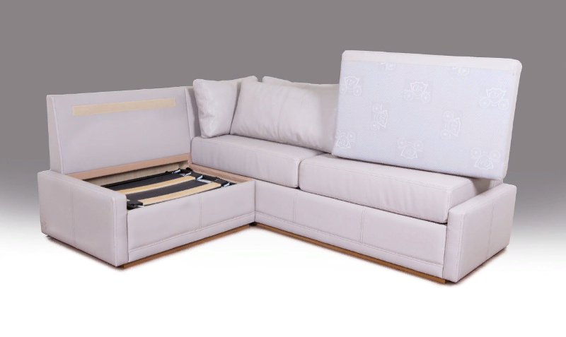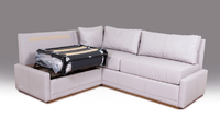 • Модель со спальным местом. В одной из частей углового дивана имеется механизм трансформации «французская раскладушка» Механизм трансформации весьма прост и требует минимальных усилий: достаточно снять подушки и поднять конструкцию спального места за специальную ручку в передней части раскладушки, после чего, установленный горизонтально механизм раскладушки дважды разворачивается и устанавливается на опорные ножки. При раскрытии раскладушки, ножки автоматически раскладываются и жёстко удерживаются в перпендикулярном полу положении с небольшим наклоном вперёд. Данный механизм трансформации напоминает разворачивание свитка и обеспечивает дивану компактность в сложенном виде и достаточно просторное спальное место в разложенном виде.