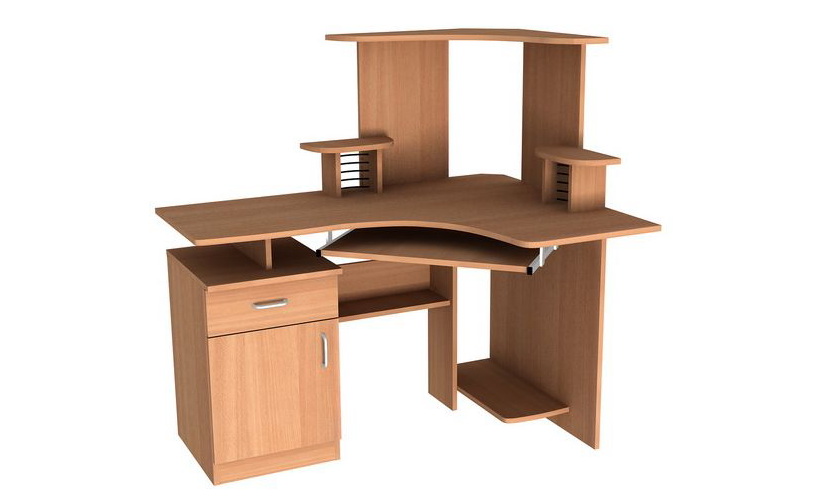 Оснащен надстройкой,  ержателями для хранения CD-дисков и полками.  Под столом находится вместительная тумба с выдвижным ящиком.